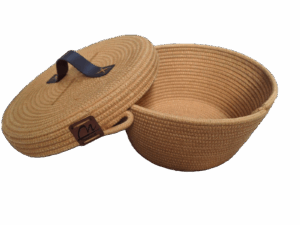 Diferenciais: Tampa com alça em couro sintético, design artesanal exclusivo, acabamento resistente.
